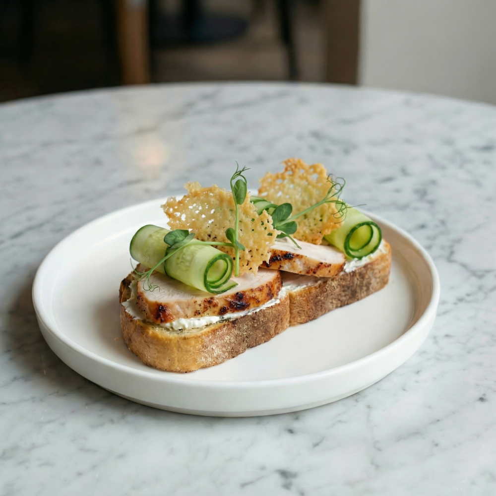 Сытная закуска на основе чиабатты с мягким творожным сыром и слайсами копченой куриной грудки. Вкус дополняют свежий огурец и пикантные чипсы из пармезана.