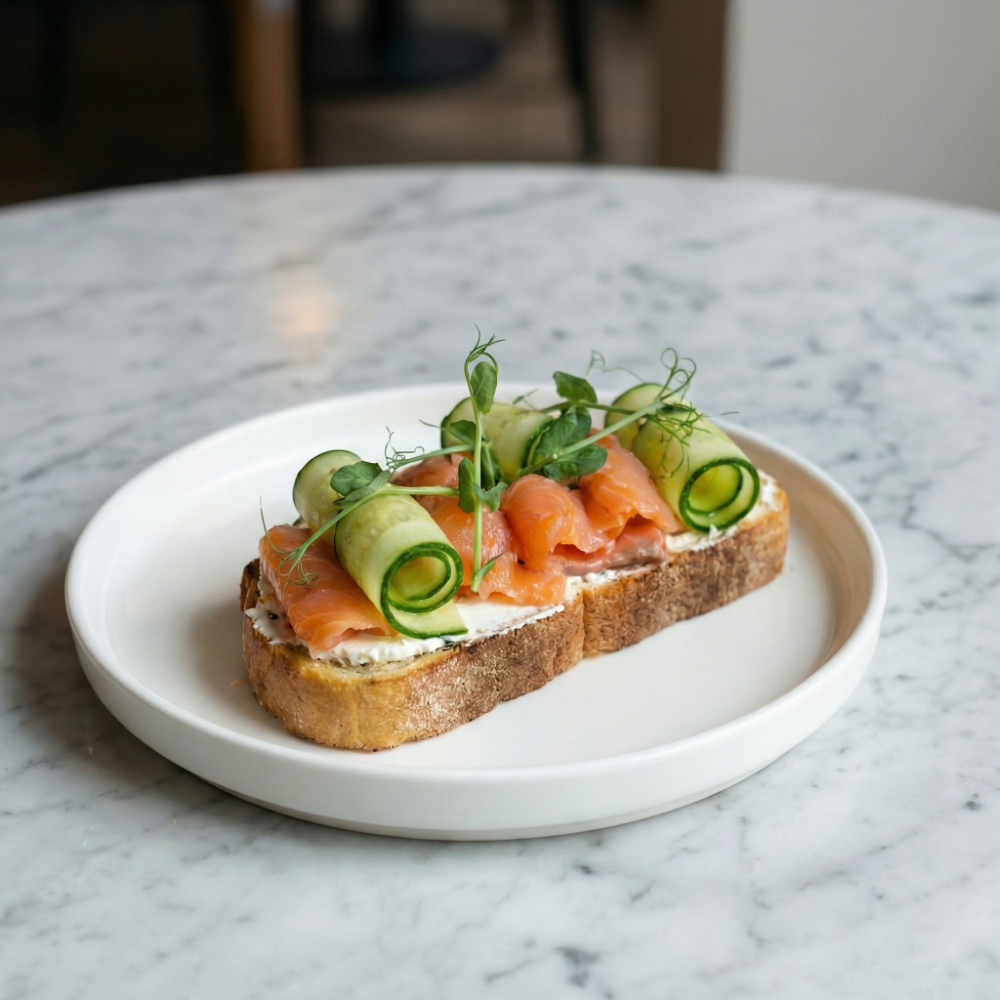 Изысканное сочетание подсушенной чиабатты и нежной форели нашего собственного слабого посола. Гармонично дополняется слоем творожного сыра и ломтиком свежего огурца.