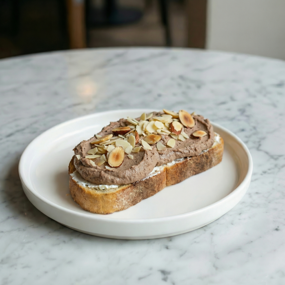 Поджаренная хрустящая чиабатта, щедро смазанная нежным домашним паштетом из куриной печени. Блюдо украшено лепестками миндаля, придающими приятный ореховый акцент.