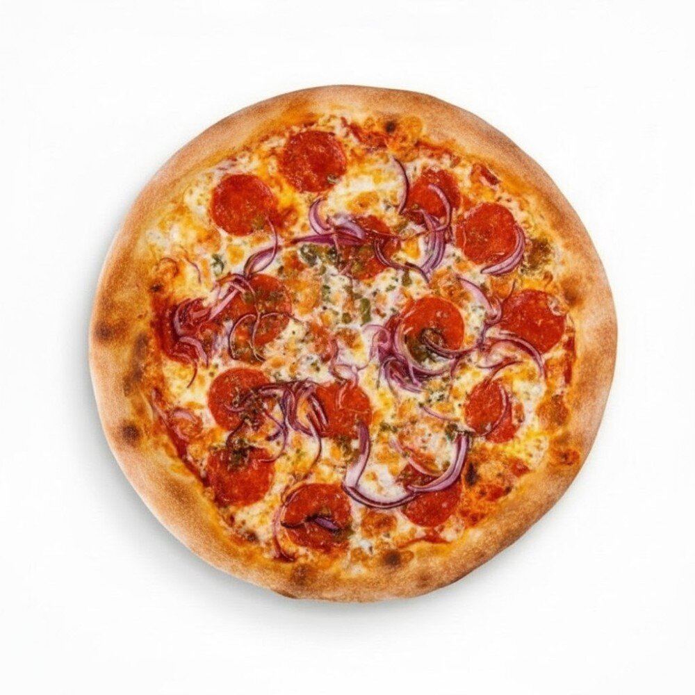 Острая пицца с халапеньо, красным луком, пепперони, сыром моцарелла и соусом барбекю.(30см)